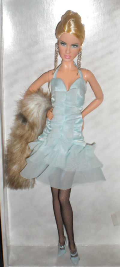 12″ Vinyl Daria, Celebutante from the Model of the Moment Collection by Mattel for the Barbie Collector Catalog. The doll came with the following information: ” Daria, Celebutante doll wears a chic city outfit, perfect for a model on the go. Light blue charmeuse dress, featuring ruffles galore, is worn over a chiffon and tricot petticoat. A faux lynx fur plush stole lined with charmeuse warm her shoulder. Black mesh hose and Mary Jane pumps complete the ensemble. The Models of the Moment are designed in El Segundo, California for Mattel Toys.