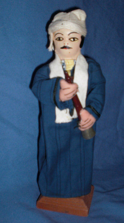 8 1/2″ Painted 1960’s Leather Man in Blue Robes with a Water Pipe. I purchased the doll in 2007 from a seller in Hopewell, New York.