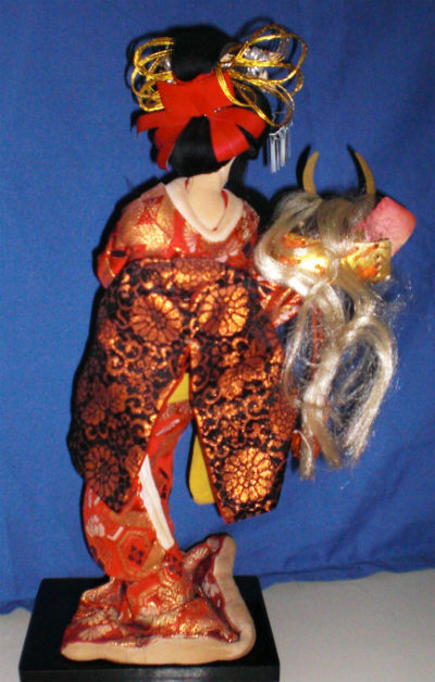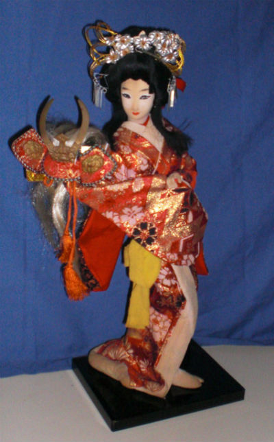 13″ Cloth 1960’s Geisha with Samurai Helmet. The doll originally belonged to a military veteran who purchased dolls in the different countries he was stationed in. I purchased this doll in 2007 from a seller in Dunkirk, New York.