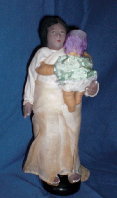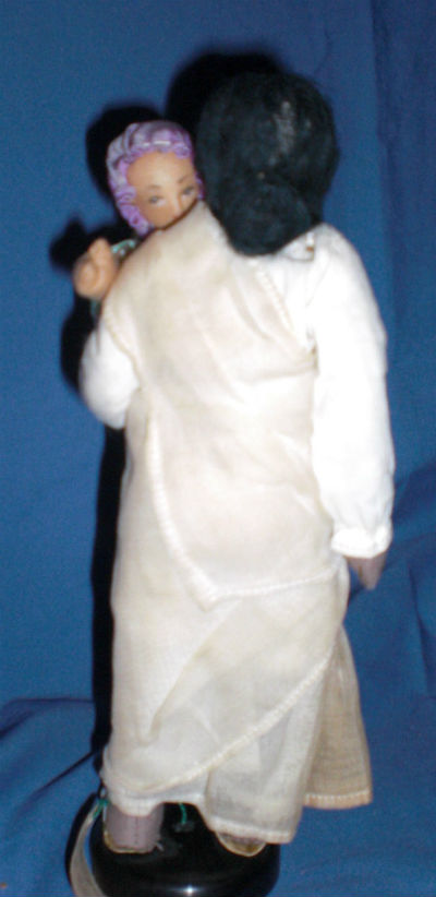 Indian Ayya with BabyIndian Ayya with Baby Backside8″ Cloth Kimport Ayah ( nursemaid) with Baby. The doll is originally from the estate of Phillis Stull of Murphyboro, Illinois. Ms. Stull had over a 1000 dolls in her collection. She was an avid traveler and collected the dolls on many of her trips and also purchased  a number of dolls from Kimport Dolls of Independence, Missouri.