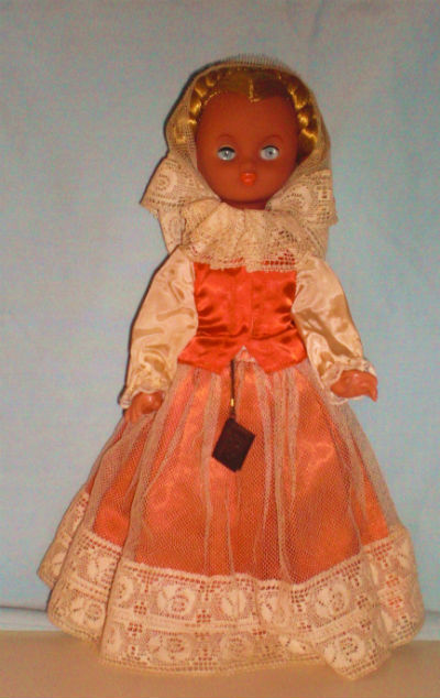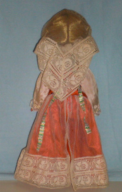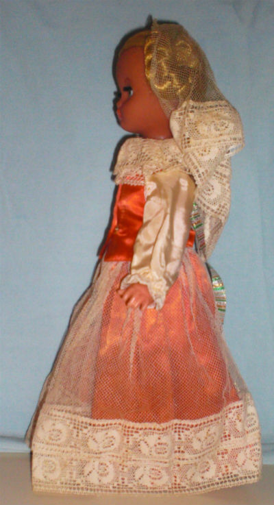 Polish Warsaw lady-Polish Warsaw lady side-Polish Warsaw Lady back-14 1/2″ Vinyl Polish Girl in Orange. The doll wears a necklace with the symbol of Warsaw. I received the doll from Zofia Baca, who was visiting me from Sosnowiec, Poland in 1979.