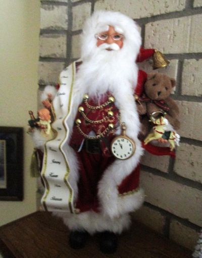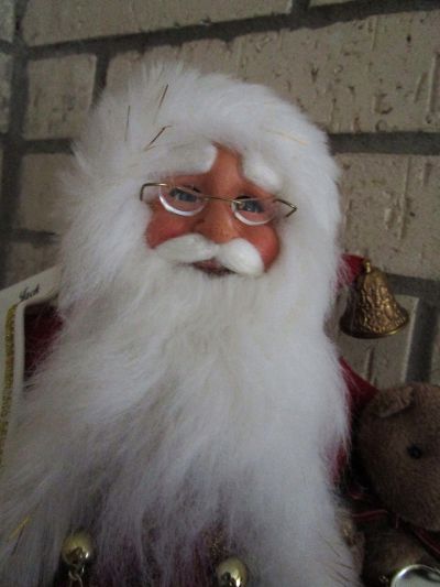 16 1/2″Cloth and Resin Karen Didion Original Santa. The doll was purchased in 2025 at the Hallmark Gift Store in Pasadena, Texas.
